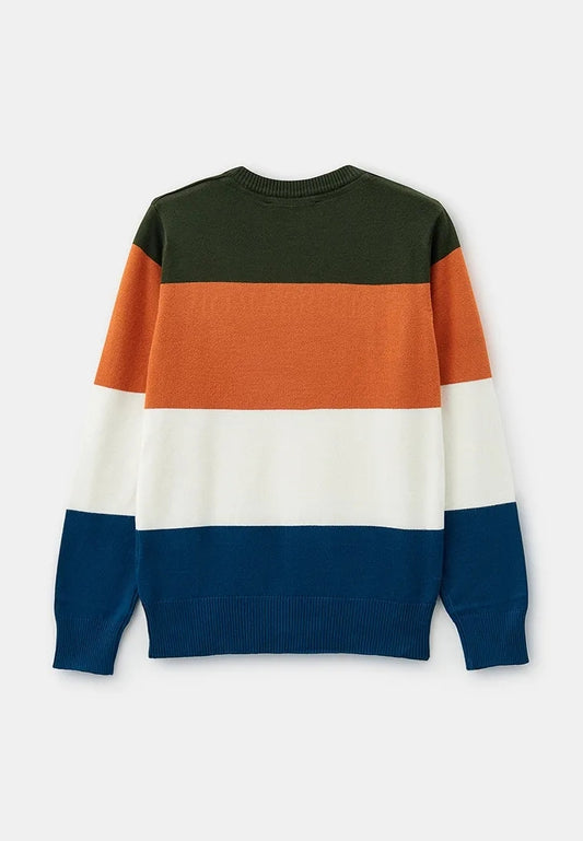 Maglione girocollo da ragazzo con fasce multicolor e logo lettering sul davanti