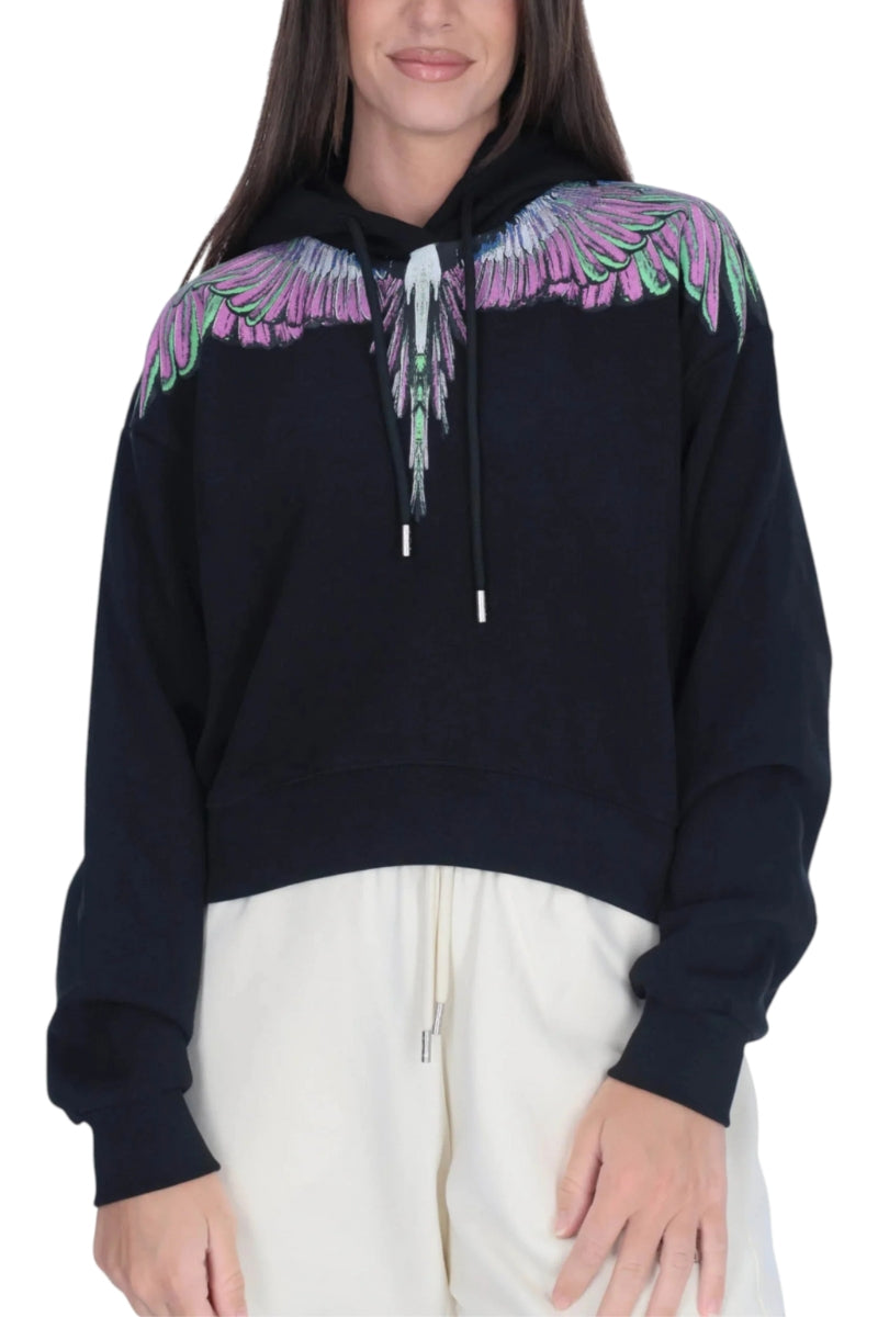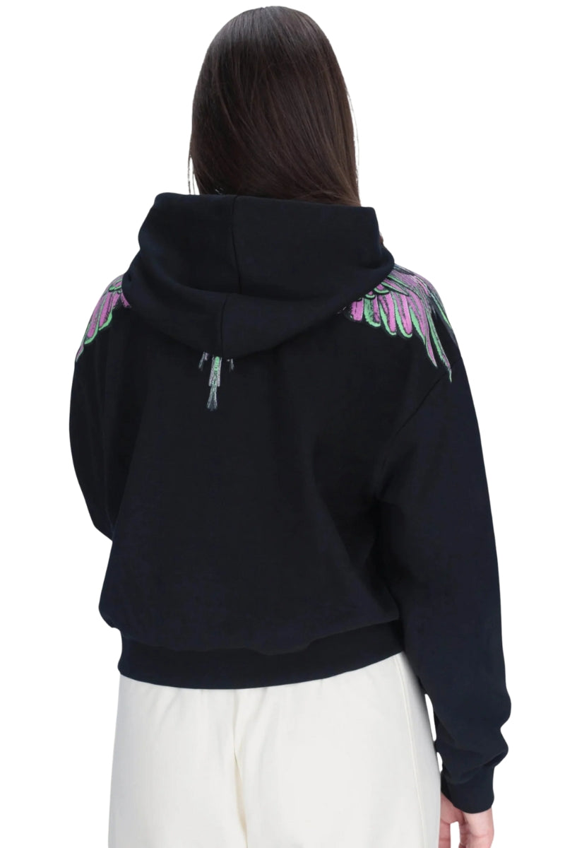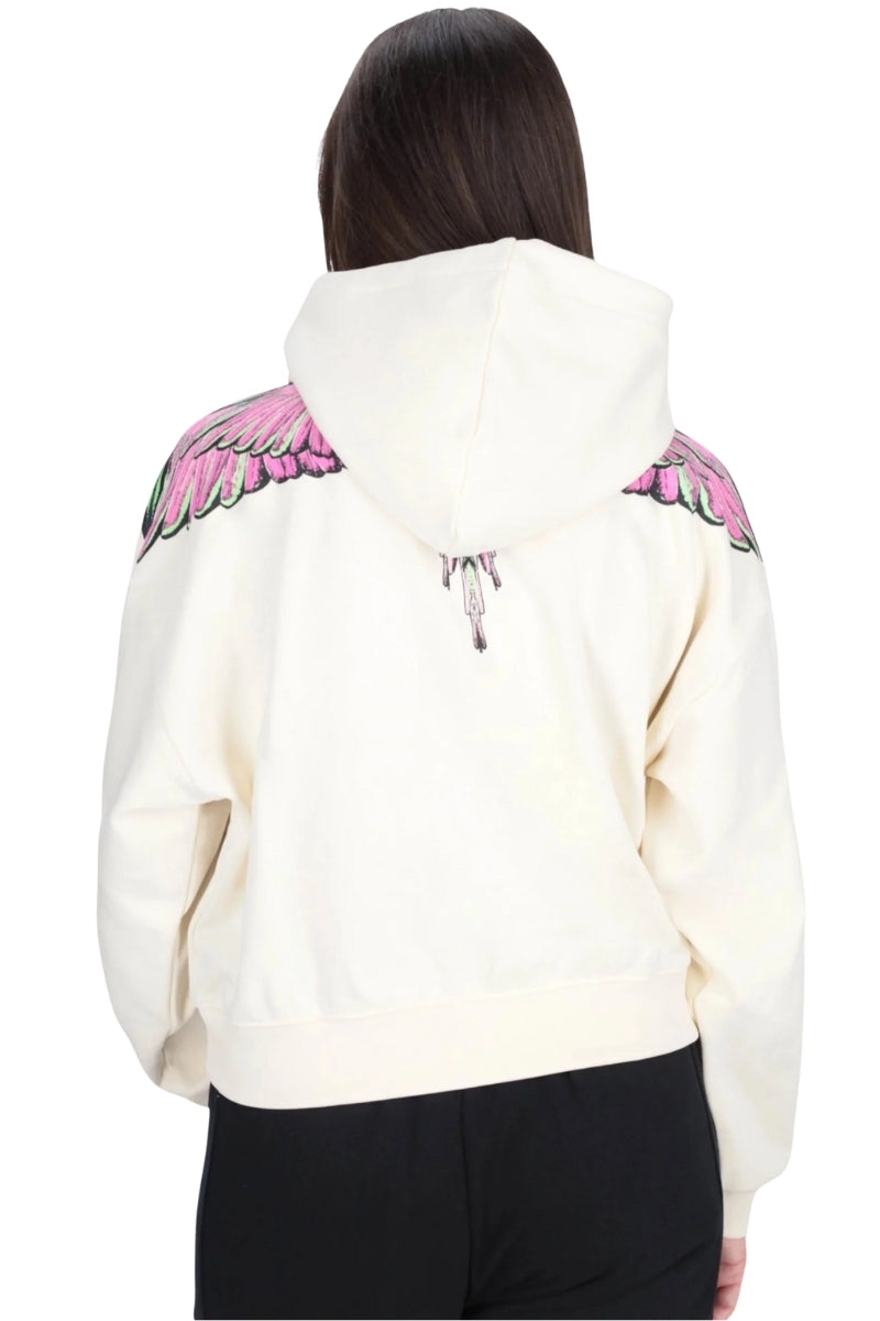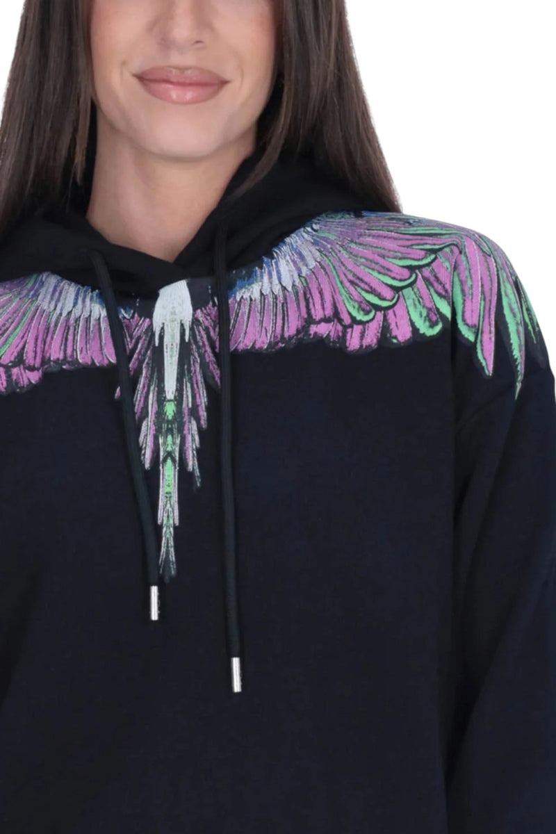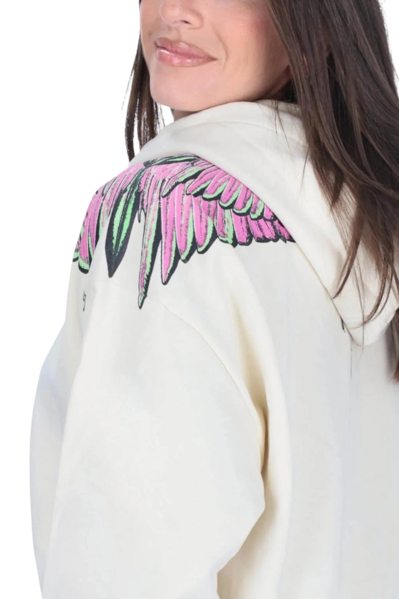 Il cappuccio fisso con coulisse dona un tocco sportivo e funzionale, mentre le maniche lunghe e le finiture con fondo e polsini elasticizzati a costine garantiscono una vestibilità stabile e avvolgente. A caratterizzare il modello è la stampa iconica con ali stilizzate, proposta sia sul fronte che sul retro, simbolo distintivo del brand che aggiunge grinta e personalità immediata.