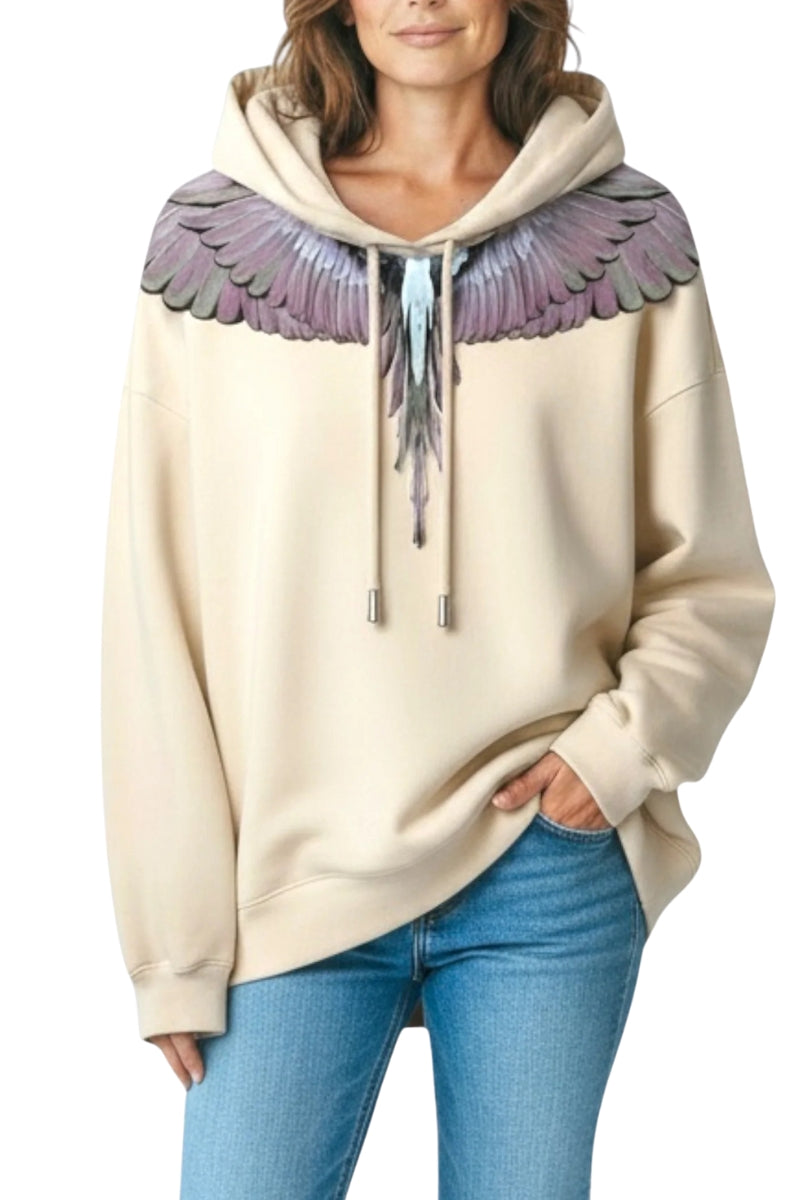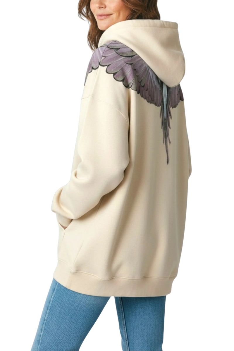 A firmare il design, la stampa iconica con ali stilizzate, presente sia sul fronte che sul retro, simbolo distintivo del brand che illumina la felpa con un tocco grafico potente e immediatamente riconoscibile.