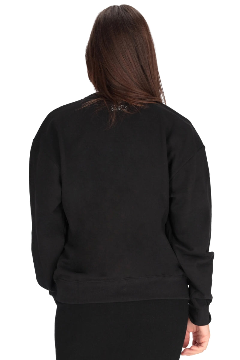 Il girocollo, le maniche lunghe e la vestibilità regolare garantiscono praticità e libertà di movimento, mentre collo, fondo e polsini elasticizzati a costine donano stabilità alla silhouette e un fit impeccabile. A rendere unica questa felpa è il celebre design iconico sulle spalle, impreziosito da strass che catturano la luce e aggiungono un tocco glamour all’estetica streetwear del brand.