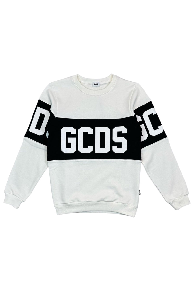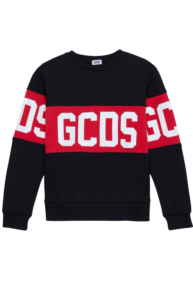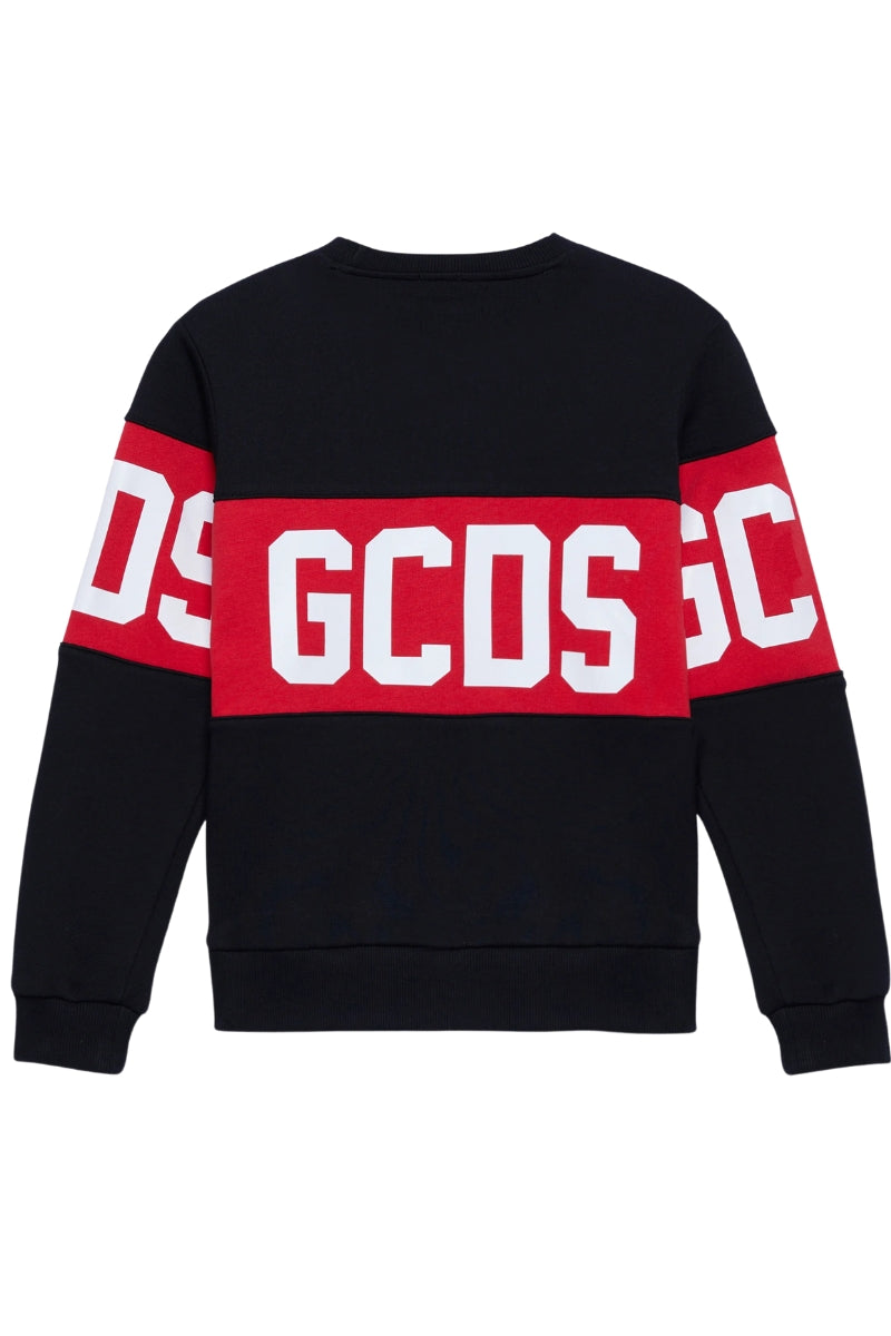 Il design girocollo con maniche lunghe è completato da fondo e polsini a costine, per una vestibilità precisa e un look sempre ordinato. A dominare la scena, la maxi banda con logo GCDS intarsiato a contrasto che attraversa fronte e retro: una firma bold, iconica, che racconta subito lo stile deciso del brand.