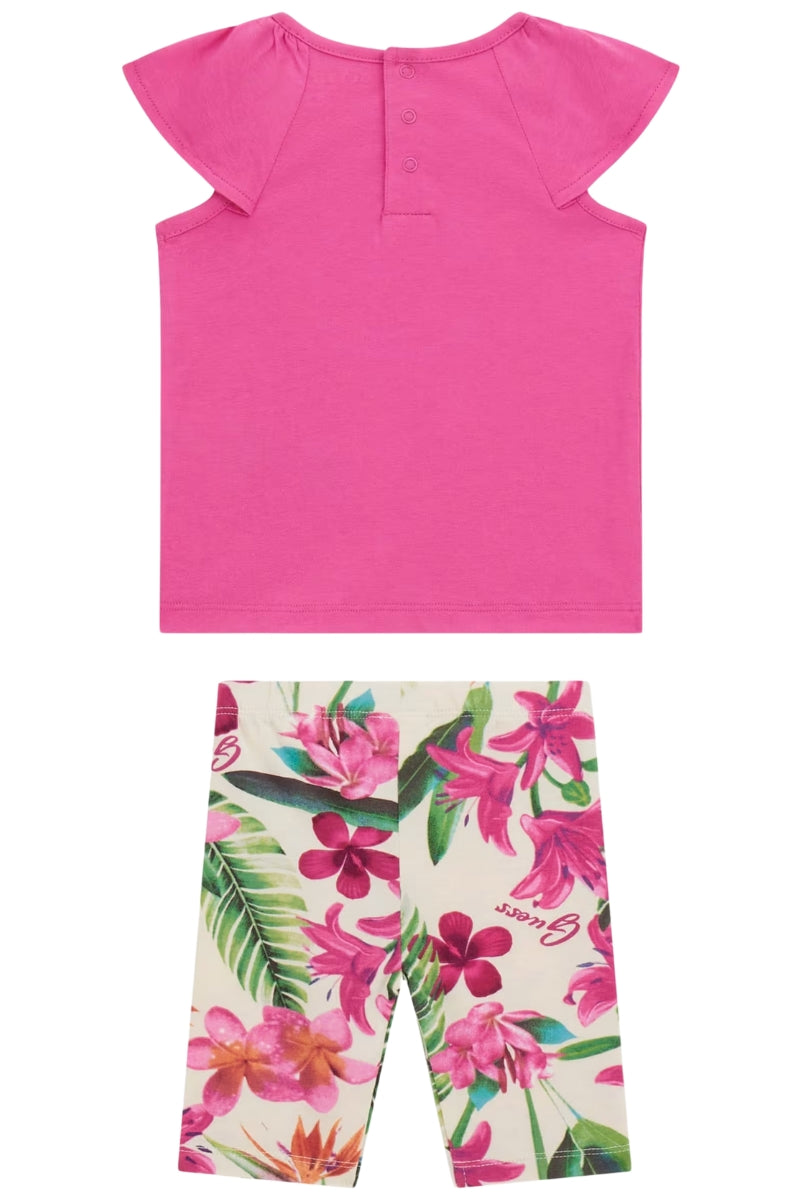 Un’esplosione di colore e comfort per le prime giornate di sole! Il completo 2 pezzi da neonata Guess è la scelta perfetta per la stagione primavera/estate, pensato per offrire stile e libertà di movimento. La t-shirt girocollo, in morbido jersey di cotone, presenta maniche corte ad aletta che donano un tocco fresco e delicato. Il design è arricchito dalla stampa floreale all over, che porta allegria e vivacità, e dal logo ricamato G sul davanti, un dettaglio distintivo che firma l’outfit con eleganza.