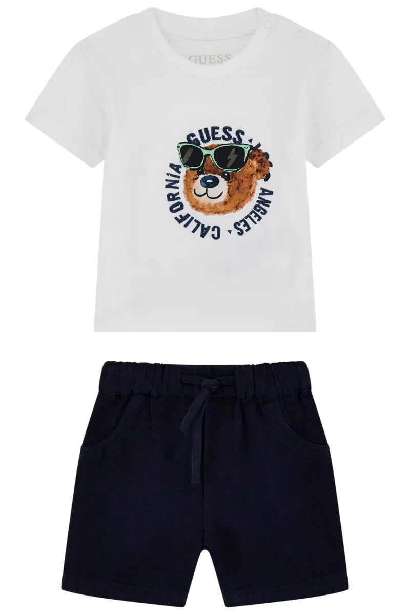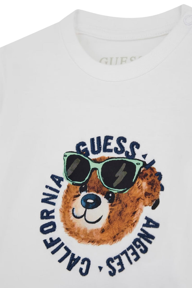 A rendere questo outfit irresistibile ci pensa la stampa con logo GUESS e l’orsacchiotto con occhiali da sole: un dettaglio simpatico e originale che strappa un sorriso a ogni sguardo. Completa il look il triangolo logato GUESS sulla tasca posteriore dei bermuda, firma iconica del brand.
