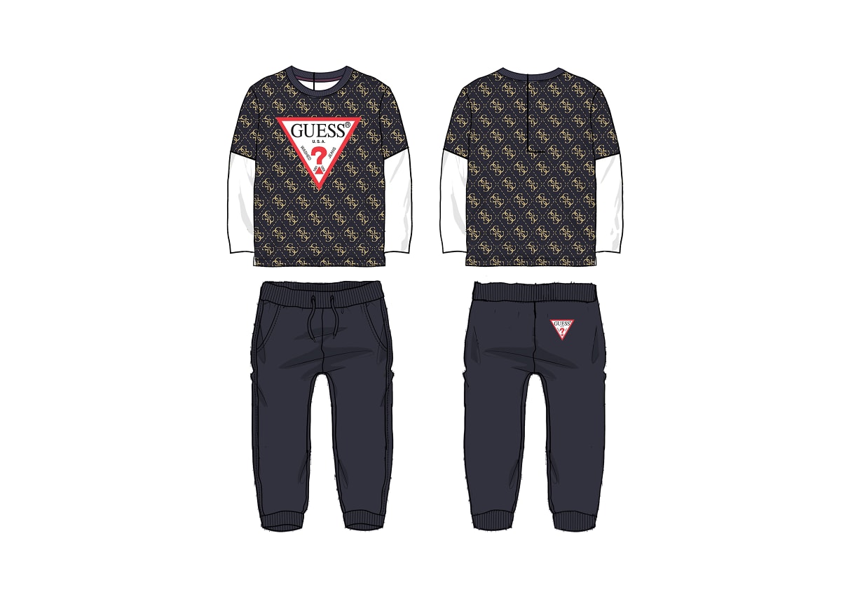 I pantaloni coordinati, con vita elasticizzata regolabile con coulisse e fondo a costine, garantiscono libertà di movimento in ogni momento. Le tasche laterali aggiungono un tocco pratico, mentre il triangolo logato stampato sul retro completa il look con un dettaglio firmato Guess.