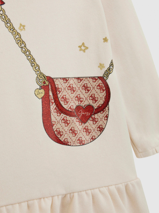 Il girocollo classico e le maniche lunghe lo rendono ideale per ogni occasione, dalla scuola agli eventi speciali. La protagonista del look? Una deliziosa stampa con borsetta e logo Guess, impreziosita da glitter scintillanti che faranno brillare ogni passo.