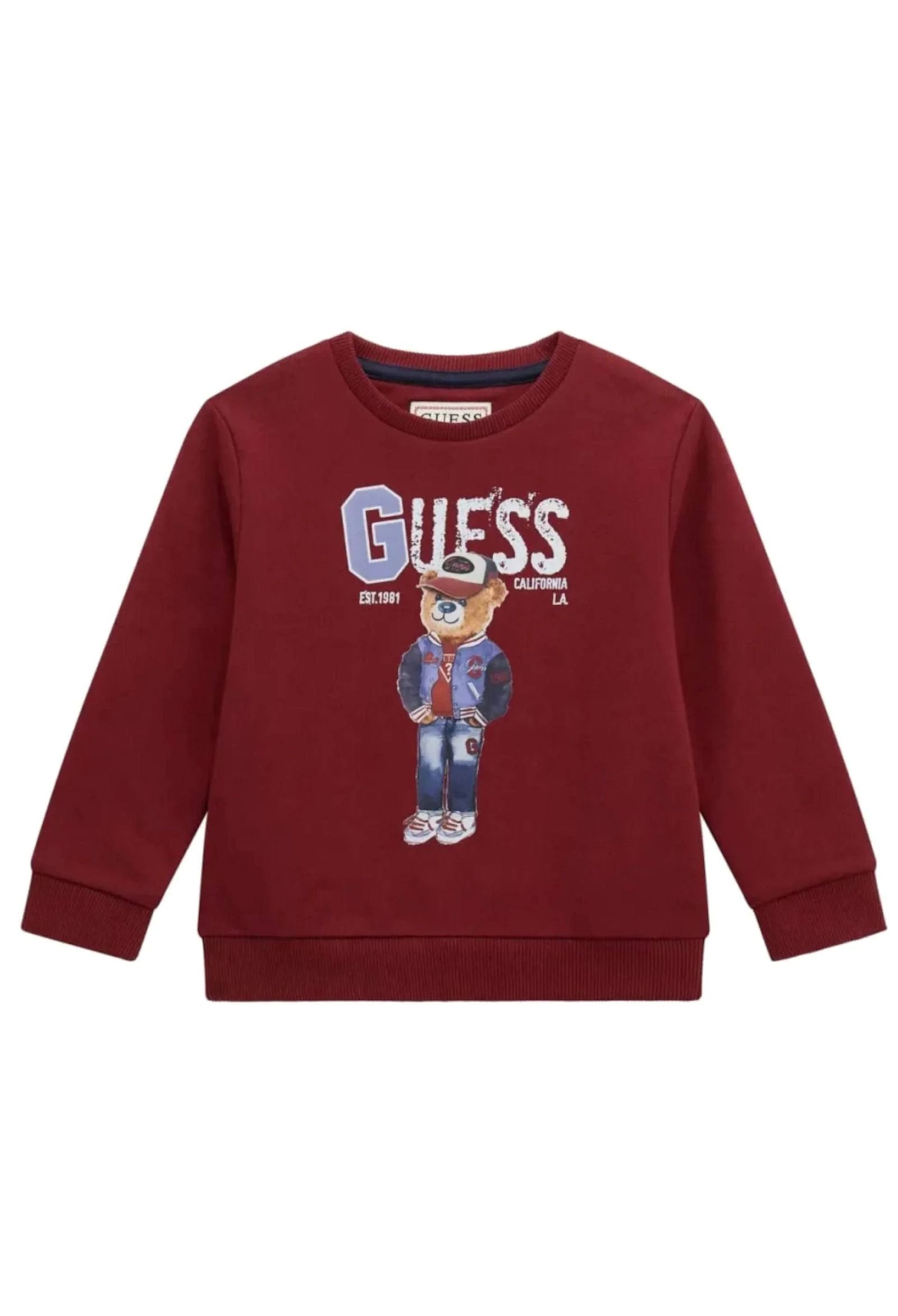 Il girocollo e i bordi elasticizzati a costine su collo, fondo e polsini assicurano una vestibilità confortevole, mentre la stampa con orsacchiotto e logo lettering Guess regala un tocco tenero e divertente, perfettamente in linea con lo spirito del brand.