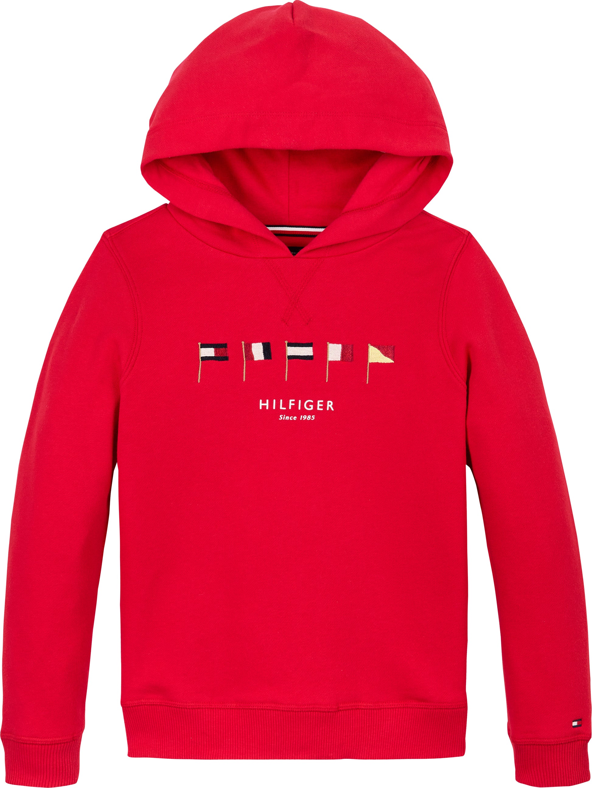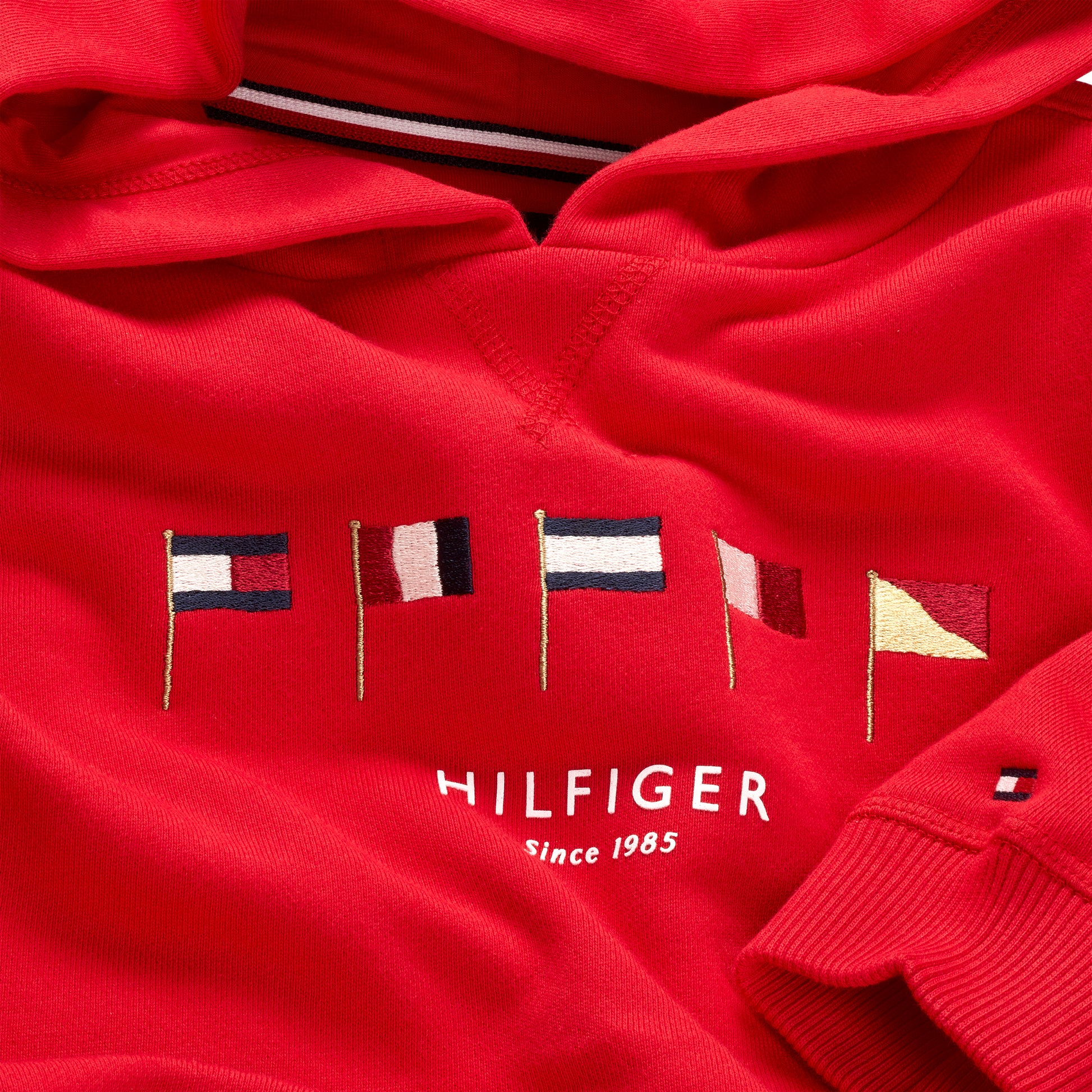 Il taglio regular fit, il cappuccio avvolgente e i dettagli a coste su fondo e polsini garantiscono una vestibilità comoda e contemporanea. Sul petto, le bandiere Tommy Hilfiger ricamate aggiungono un tocco grafico distintivo, mentre la bandierina ricamata sul polsino firma il capo con l’inconfondibile eleganza del brand.