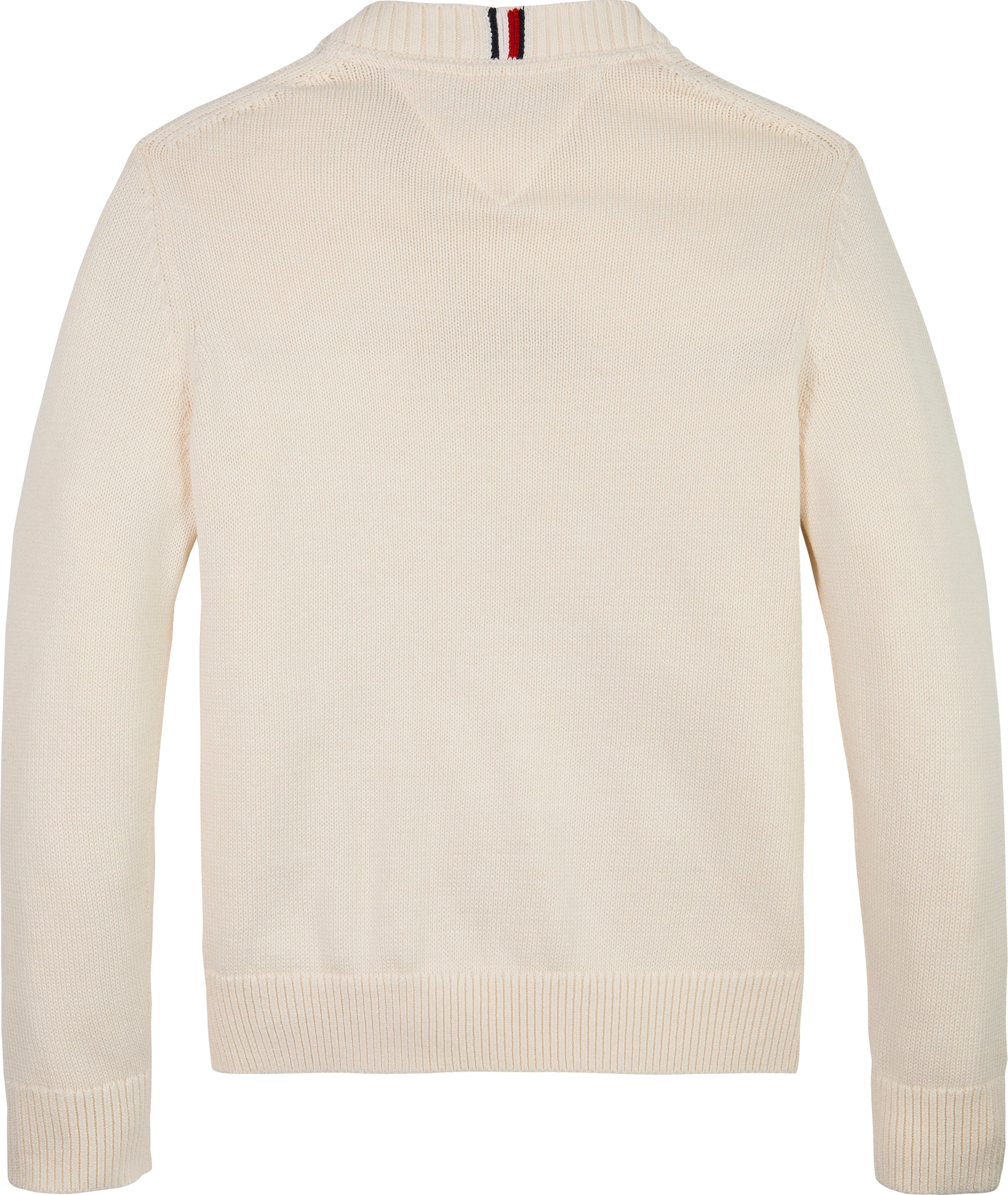 Il design è arricchito da dettagli distintivi che celebrano l’identità del brand: la bandiera con logo lettering ton sur ton ricamata sul petto, il nastro iconico sul retro del collo e la bandierina Tommy Hilfiger sulla manica rendono questo maglione immediatamente riconoscibile e sofisticato.