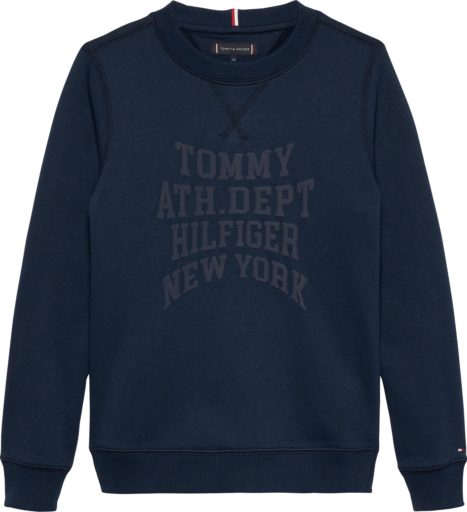 Il girocollo classico, le maniche lunghe e il collo, fondo e polsini elasticizzati a costine assicurano una vestibilità perfetta e resistente all’uso quotidiano. Sulla parte frontale spicca una maxi stampa con logo lettering ton sur ton, un dettaglio moderno e iconico che porta subito il tocco distintivo Tommy Hilfiger nel guardaroba dei più piccoli.