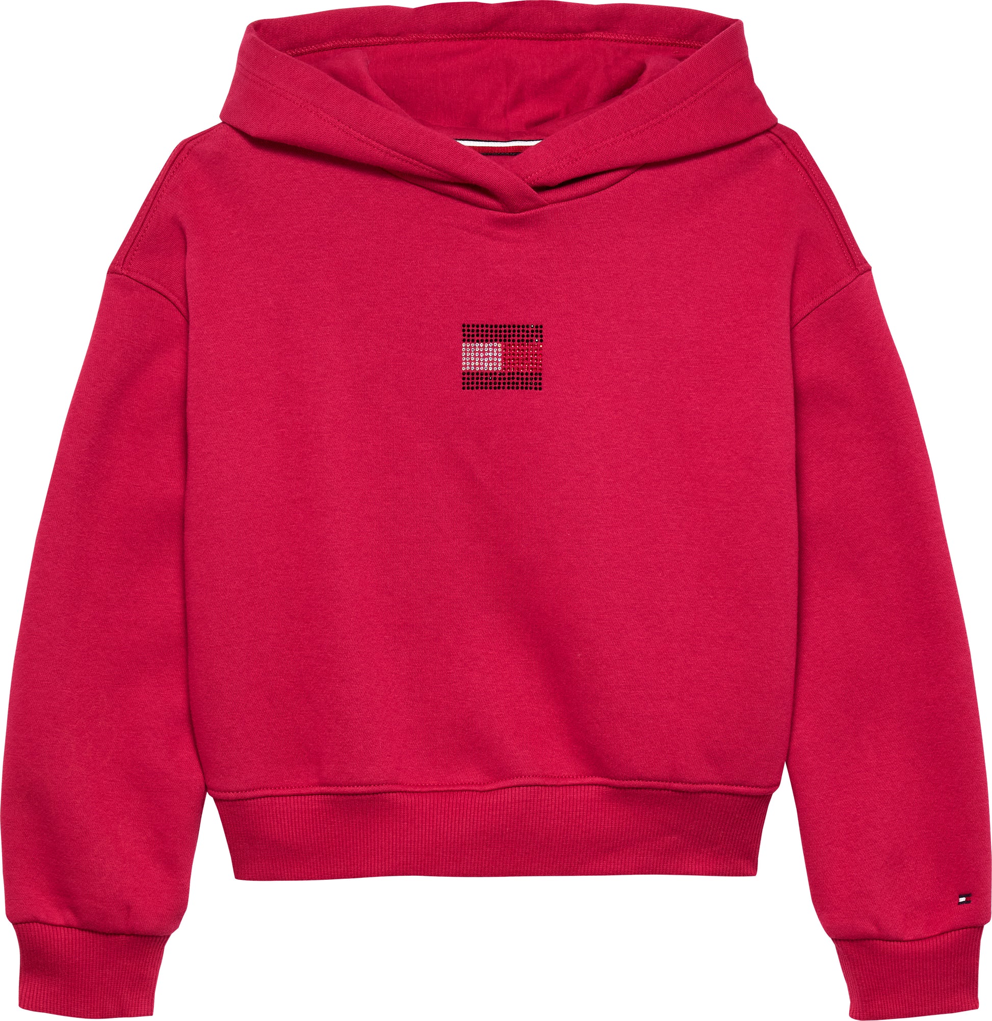 Questa felpa da ragazza Tommy Hilfiger in cotone porta una ventata di stile nella stagione autunno/inverno grazie al suo modello cropped, fresco e contemporaneo. Il cappuccio fisso e le maniche lunghe offrono comfort e praticità, mentre fondo e polsini elasticizzati a costine garantiscono una vestibilità perfetta in ogni momento.